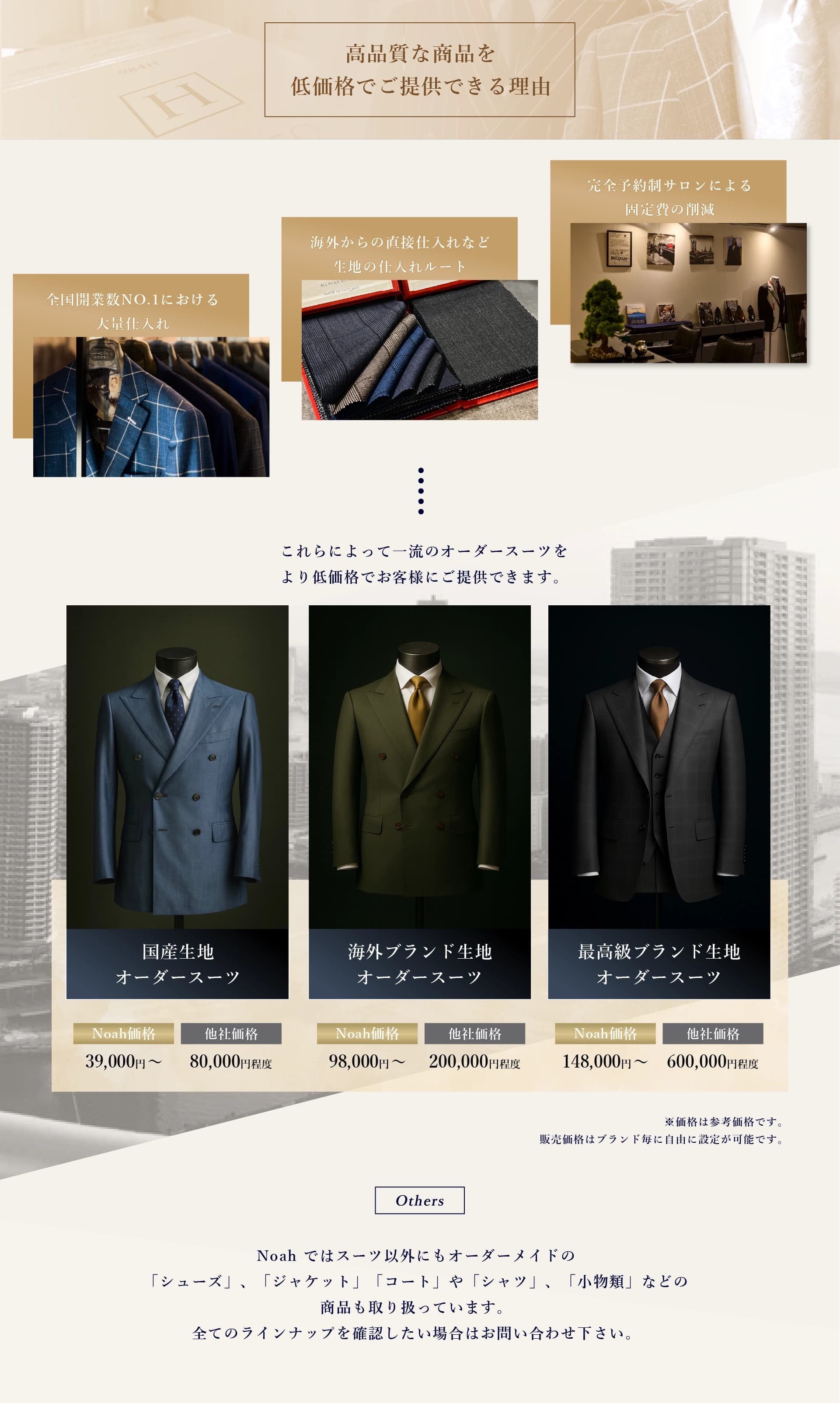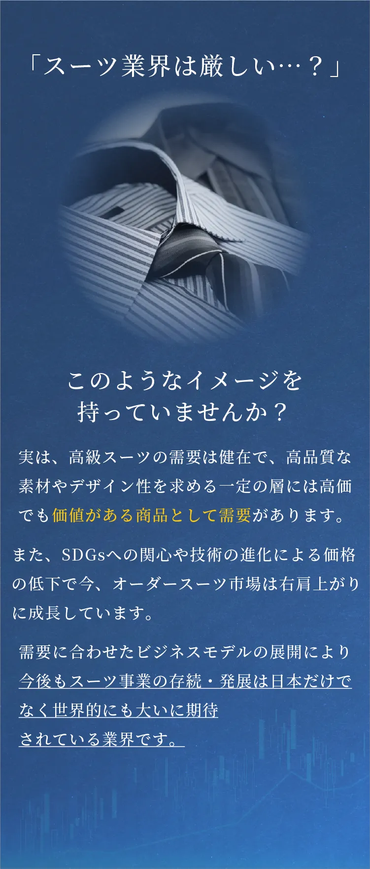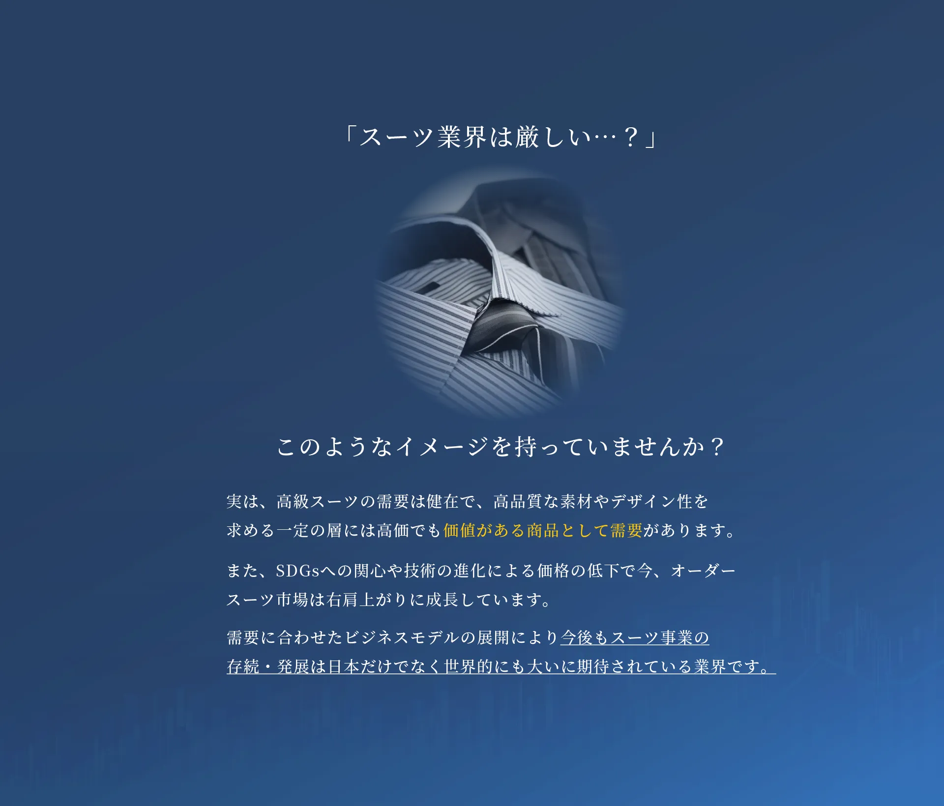 業界の発展に向け、オーダースーツサロンの無償の提供を実施。